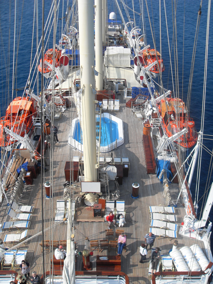 The ship is very comfortable, I found the cabin spacious and loved the outside space where there are so many place to find a nice stop to sit and enjoy the fresh air. With 2 swimming pools on board and plenty of sun loungers, lots of opportunity to relax. Also there are sailing dinghies and ribs for watersports once at anchor, including waterskiing. I climbed the mast (well up to the first crows nest – that was high enough!) with the safety lines and watchful eyes of the great entertainments team – who later produced a very funny fashion show of the ships clothes in a force 8!